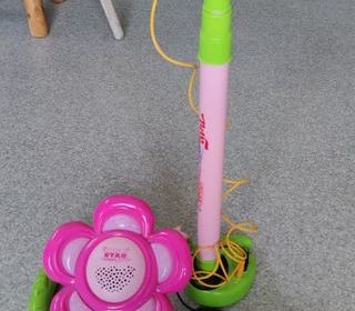 Micro avec haut parleur en forme de fleur. Tige réglable en hauteur. Une prise micro et une prise audio. Volume reglable. Excellent état. Hauteur min: 50cm Hauteur max: 105cm