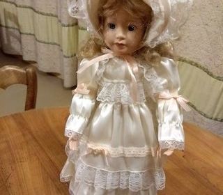 Poupée. TETE, PIEDS , MAINS , EN GRES . CORPS EN CHIFFON ,SUR SOCLE. HAUT : 42 CM . PRIX :50 € .