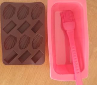 moule : à cake & petits moules à madeleines en silicone . pinceau . jamais utiliser , neuf .