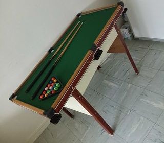 Billard pour enfant Charton en bon état. Table stable avec tapis vert, bords en bon état, vendu avec 2 queues, 1 triangle et jeu complet de billes. Idéal pour initier les enfan