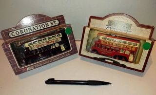 Lot de 2 Bus miniatures à impériale bien emballés vintages Lledo Neufs, déballés uniquement pour les photos Echelle non indiquée mais le stylo vous donne une idée de la taille