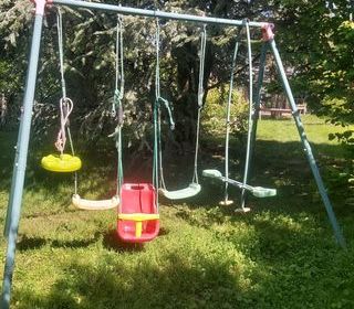 Portique balançoire comprenant 2 balançoires, Plus une balançoire siège jeune enfant, une balançoire face à face et une suspension forme ronde.