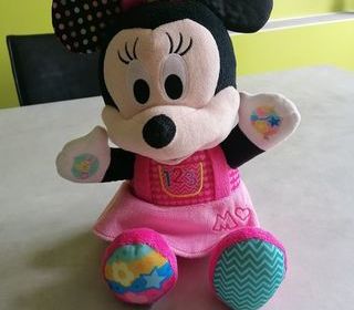 Poupée Disney Baby Minnie qui chante. Multicolore. 3 boutons interactifs sur les mains et sur le ventre, la peluche chante (en allemand uniquement). Mesure 40 cm. Prix 12 €