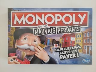 Bonjour, Je mets en vente le jeu de société Monopoly édition Pour les mauvais perdants. État complètement neuf encore sous cellophane au prix de 15