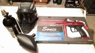 paintball avec visière pas en bon état avec pistolet cartouche et voir photos,vous pouvez toujours me faire une offre .