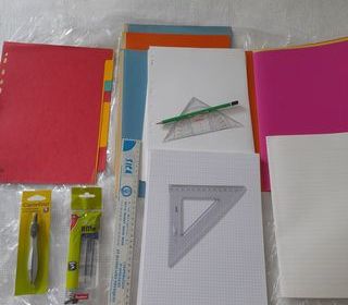 lot de fournitures scolaires comprenant : 1 règle plate de 30 cm graduée, 1 crayon de bois , lot de 4 stylos bille bleus, 6 intercalaires, 3 chemises à dos toilé , 12 chemises simp
