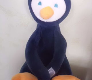 peluche pingouin bleu marine blanc et orange en velours gratte 27 cm en position assis marque tomkids tres bon etat envoi rapide ref 435