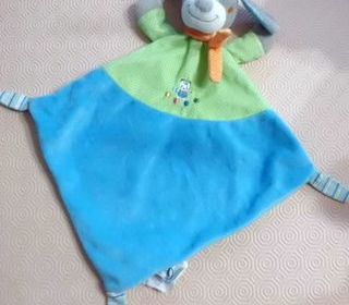 doudou plat chien gris vert et bleu en velours gratte 24 cm de cote marque mots d'enfants tres bon etat envoi rapide ref 428
