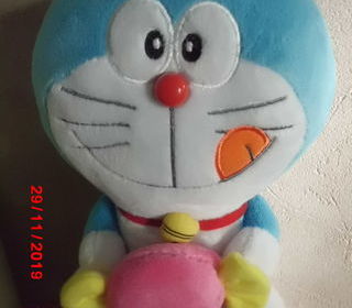 peluche chat bleu et blanc en velours gratte avec son bonbon entre les pattes 18 cm en position assis marque doraemon tres bon etat envoi rapide ref 404