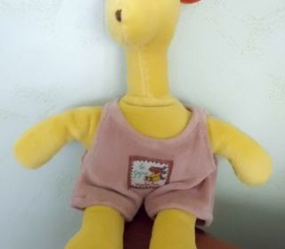 peluche doudou girafe jaune et rouge avec sa salopette beige imprime les zazous 22 cm marque moulin roty tres bon etat envoi rapide ref 430