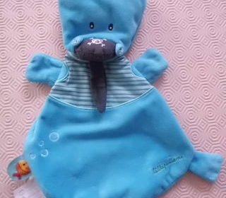 doudou hippopotame bleu en velours gratte fait marionnette au niveau de la tete et des mains 33 cm marque lilliputiens tres bon etat envoi rapide ref 435