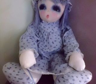 POUPEE CHIFFON AVEC SA ROBE ET BONNET BLEU A FLEURS VISAGE PEINT 55 cm marque marie d'o annee 1980 inscrit sur la nuque bon etat envoi rapide