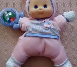 poupee chiffon rose hochet dans la main tete plastique corps en velours gratte et tissu a fleurs 30 cm maruqe fisher price annee 2002bon etat envoi rapide ref 430