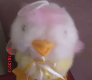 peluche poussin jaune rose et blanc qui quine quand on le secoue 15 cm a accrocher marque potier vandier tres bon etat envoi rapide ref 397