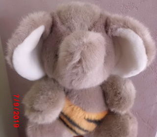 peluche elephant marron glacé interieur des oreilles blanc culotte rousse raye noir 23 cm en position assis marque nicotoy tres bon etat envoi rapide ref 390