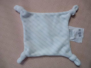 doudou plat blanc raye bleu ciel en velours gratte l'autre face est blanche 16 cm de cote marque mes petits cailloux tres bon etat envoi rapide ref 434