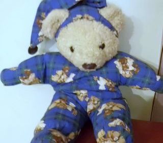 peluche ours beige corps tissu bleu a carreaux vert et imprime ourson48 cm marque caprice tres bon etat envoi rapidec ref 428