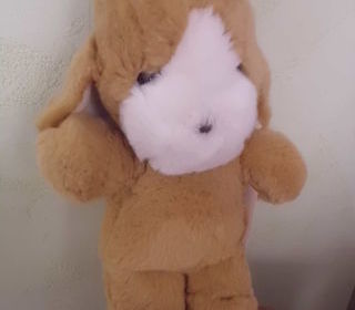 peluche chien marron et blanc yeux noir en plastique 25 cm interieur des oreilles tissu ecru marque boulgom brode sous la patte j'ai mis bon etat l'etiquette sur le cote de la pelu