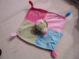 doudou plat chien beige rose et tissu a carreaux bleu l'autre face est en velours gratte rose marque lifestyle tres bon etat envoi rapide ref 434