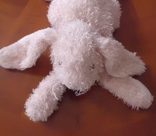 peluche lapin beige allonge interieur des oreilles et bouts des pattes velours ecru 38 cm en position allonge marque anna club plush tres bon etat envoi rapide ref 415