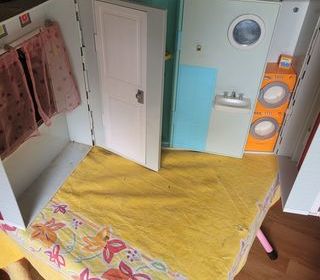 Petite maison sympathique pour Barbie avec coin cuisine et salle de bain.