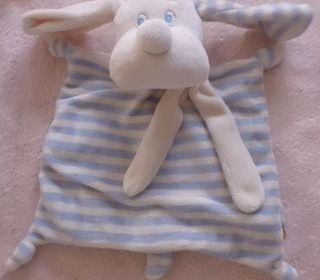 doudou semi plat chien ecru et bleu grelot dans la tete en velours gratte 20 cm marque anna club plush tres bon etat envoi rapide ref 426