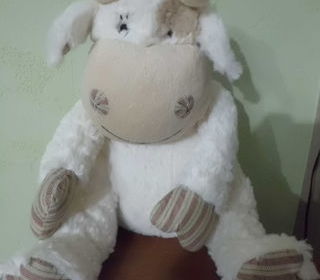peluche vache ecru et beige poil mi long bouts des pattes et inteireur des oreiles tisu beige raye bordeaux 35 cm marque enesco tres bon etat envoi rapide ref 419