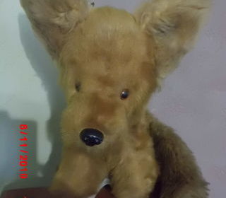 peluche renard roux vintage yeux orange et noir nez plastique noir langue en feutrine rouge 28 cm en position assis marque hubert angers tres bon etat envoi rapide ref 401