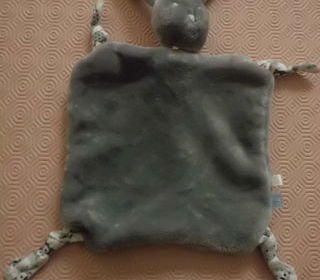 doudou lapin gris en velours gratte interieur des oreilles et noeuds en tissu blanc imprime hibou noir marque creagir tres bon etat envoi rapide ref 437