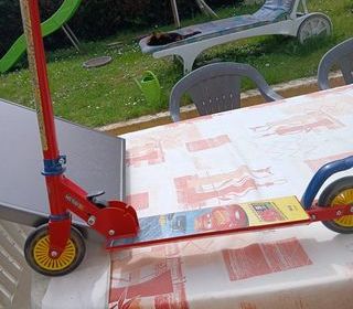 Trottinette rouge pour enfant avec décorations thématiques sur le plateau, roues jaunes et guidon réglable.