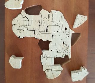 Puzzle en bois représentant le continent africain . Chacune des 28 pièces du puzzle est une représentation stylisée d'un animal de la jungle Dimensions : 17,5cm x 20cm x 2cm Tra