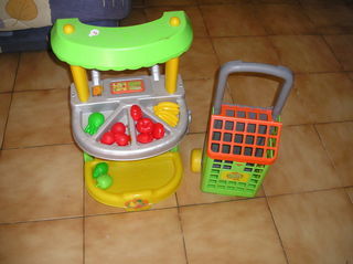 Stand du primeur Apprenons à vendre légumes et fruits Stand du primeur , avec légumes et fruit + caddy pour faire ses courses Le lot complet et indissociable. 15 €