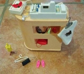 Caisse enregistreuse et accessoires pour "magasin" de mode Barbie. Fonctionne à piles : boutons qui font du bruit ou éjecte le tiroir caisse. Tous les éléments sur la photo (chauss