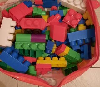 Lot de perles pour fabriquer bracelet ou collier. Pot en verre avec des perles bleues, flacon plein. Pot en plastiques avec des perles rondes ou motifs de couleur orange, jaune,