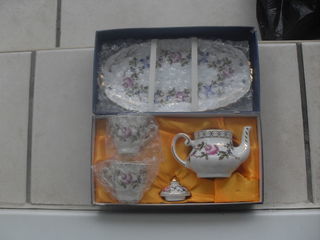 Service à thé en porcelaine blanche décors roses et dorés - dans son coffret d'origine - de préférence à prendre sur place