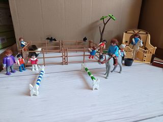 Bonjour Je vends ces playmobil inspiration Cavaliers et chevaux inspiration réf 4185 . Tout ce que vous voyez sur les photos est inclus (personnages + animaux + accessoires).