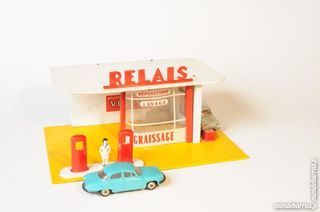 Joli garage vers 1950/60 socle, murs et toit en bois aglo, le reste en plastique (vitrine, enseigne, pompes). Publicités murales d'origine. Pour l'échelle voir les voitures Norev