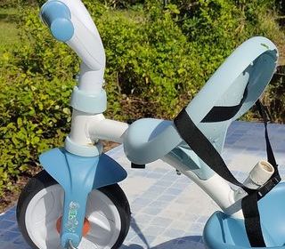 Tricycle pour enfants en plastique bleu et blanc. Équipé d'une ceinture de sécurité, de poignées ergonomiques et d'une cane parentale amovible. Idéal pour les premières promenades