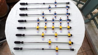 8 barres : 4 bleus et 4 jaunes Joueurs en plastique Hauteur des joueurs 10,5 cm x largeur 3 cm Barre avec joueur gardien Bleu ou jaune 2
