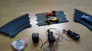 Circuit automobile Polistyl composé 27 éléments droit et courbe Longueur développée : 8 m .3 voitures qualité- 2 manettes- 1 transformateur- 1 pochette avec languettes cuivre pour