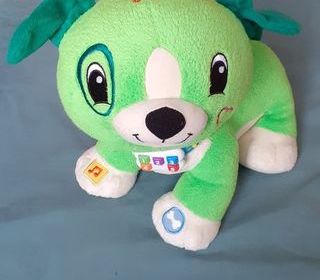 Vends une peluche musicale en tissu éponge et en forme de chien. Les 5 boutons correspondent à 5 livres de couleur différente et permettent d'écouter l'histoire contenue dans le l