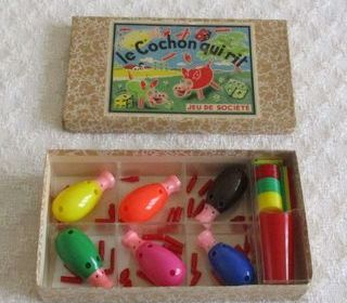 Ancien Jeu le cochon qui rit, (années 50) version 6 cochons, complet, en bon état, se composant de : - 6 cochons avec 12 yeux, 24 pattes, 12 oreilles, 6 queues. - 1 gobelet avec