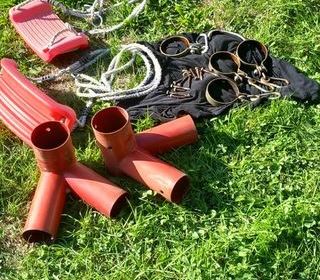 2 Écarteurs de poteaux , anneaux avec crochets , boulonnerie , 2 balancelles . État moyen. Région roanne 42 .