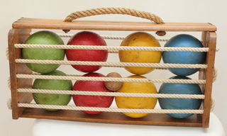 Jeu de plage 1950 boules en bois pétanque Coffret en bois verni avec cordage 8 boules en bois 1 cochonnet bois 1 boule fendue Bon état d'ensemble Envoi possible Rmp métro Cor