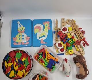 Bonjour, nous mettons en vente ce lot de jouets divers en bois de construction et mosaïque + deux mini peluches vendu d'occasion. État : Bon. ??N'hésitez pas consulter notre prof