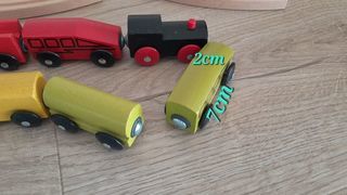 Train en bois ,12 rails courbes, 1 pont , 5-4 rails droites . bon état peu utilisé, le tout en bon état. Les wagons s'accrochent seul attirer par des aimants au bout de chaque wago