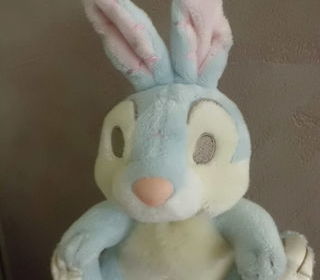 peluche lapin panpan bleu ciel et ecru bouts des pattes tissu satin ecru interieur des oreilles rose 21 cm avec les oreilles marque disney tres bon etat envoi rapide ref 411