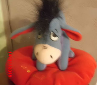 peluche bourriquet en velours gratte assis sur un coeur rouge brode love me 16 cm pour bourriquet et 20 cm pour le coeur marque disney tres bon etat envoi rapide ref 319