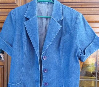 TAILLEUR EN JEANS FEMME T 42/44 VESTE A MANCHES COURTES, ENCOLURE EN V, LE DEVANT EST FERME PAR 3 BOUTONS. DE CHAQUE COTE 2 PETITES POCHES EN DECO FERMEES PAR 1 BOUTON LES MANCH