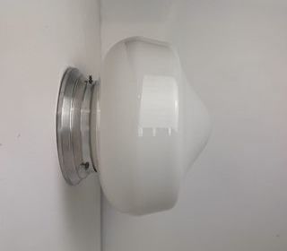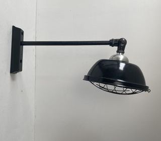 Ancienne lampe potence en acier avec son abat-jour en tôle émaillé de forme ovale. Possibilité d'articulation au niveau du second bras. En très bel état. Présence de traces de rou